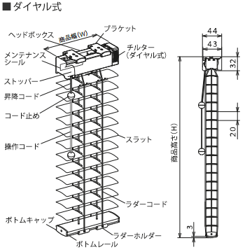 スラットの角度調節はヘッドボックス上部のダイヤルで調節します。スラットの昇降はコードで行います。