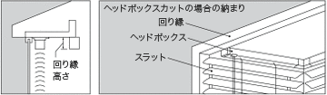 (2)回り縁の高さが30mm以内の時、スラットの長さよりヘッドボックスを短くカットすることで、両サイドの隙間をおおっての取り付けができます(ヘッドボックスカットの場合)