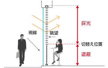 上部のスラットは角度を調整して採光を細かく調整できます。上下の切替え位置はシーンに合わせてご指定いただけます。