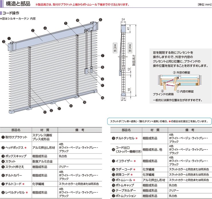 スラット(羽根)やコード類が窓枠に干渉しないよう、幅は窓枠の内側寸法から10mm以上引いてください。