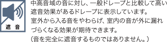 生地裏面に特殊なアクリル樹脂コーティングやポリウレタンラミネートの加工をすることで、一般のドレープカーテンに比べて高い遮音性を有します。 騒音など屋外から入る音(特に高周波数)を和らげる効果がありますので、窓外の音が気になる部屋などに最適です。(当商品は音を完全に遮断するものではありません。)