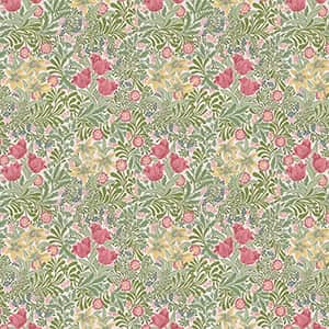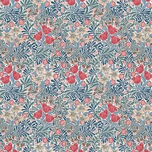 1877年にウィリアム・モリスのデザインとして登録された柄で、咲き誇る花々と生命力に満ちた葉が織りなす、楽園のような情景を描いています。重なり合う葉の表情には、織りの立体感と色彩の奥行きが巧みに表現され、空間に深みをもたらします。ナチュラルな風合いのベースの上に、多彩な色使いと光沢のある花々が際立ち、華やかさと上品さが共存する仕上がりとなっています。