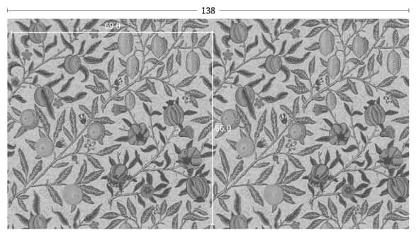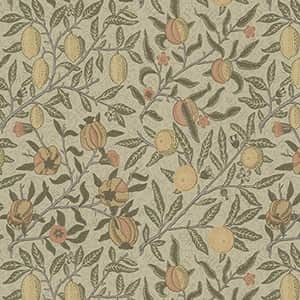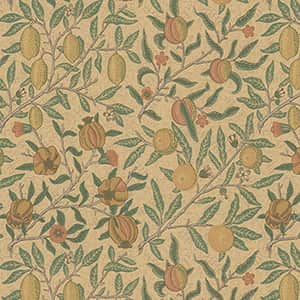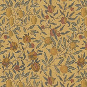 ウィリアム・モリスのデザインの中でも有名なこのフルーツの柄は、1864年にモリスが第二作目の壁紙として描いたもので、当時は版木を用いてハンドプリントされていました。版木のやわらかく味わいのあるタッチを織物で表現しています。