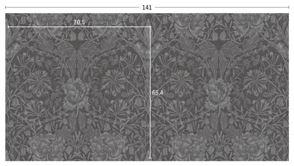 1876年に製作されたウィリアム・モリスの壁紙のデザインを織物にしました。地紋に渦巻く葉の上にチューリップとスイカズラを配したモリス独特の構成を、織組織を駆使して深みのある色合や奥行きで、魅力的に表現しています。