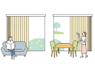 スラットの向きを変えるだけで採光、眺望をコントロールできる縦型ブラインド(バーチカルブラインド)は、電動タイプにすることによって、スムーズなルーバー回転や開閉操作を実現します。