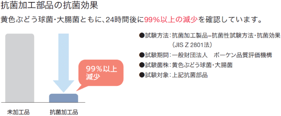 抗菌・衛生面などの安全性へのニーズにお応えし、操作時に手の触れる部品の「抗菌化」を行いました。抗菌加工製品として”SIAAマーク”を取得しました。