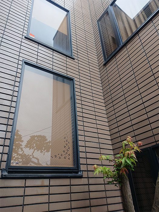 窓や内装がブラウンなのでウォールナットの品はずっと以前からこの家に備わっていたかのようにひっそりと調和しているのが憎い。