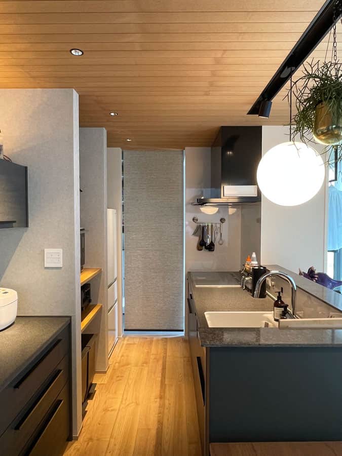 キッチンとパントリーの間仕切りとして、デザイン性の高いロールスクリーンを設置。