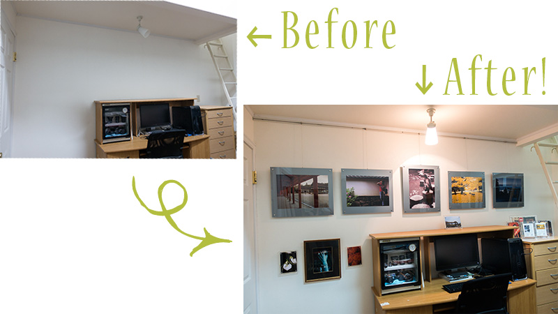 ピクチャーレールはその商品の特性上、使用例が説明しづらい部分があるのですが、O様のお写真は「Before」「After」が大変わかりやすく、ギャラリーとして素敵に生まれ変わった壁がお見事です。